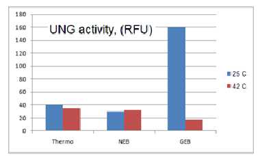 GEB的UNG在25°C時(shí)具有很高的活性,而在42°C時(shí)則失去活性